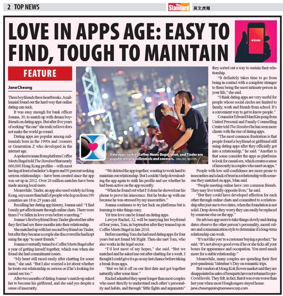 下載全文:Love in apps age: Easy to find, tough to maintain (原文載於《The Standard 英文虎報》2023年2月14日)